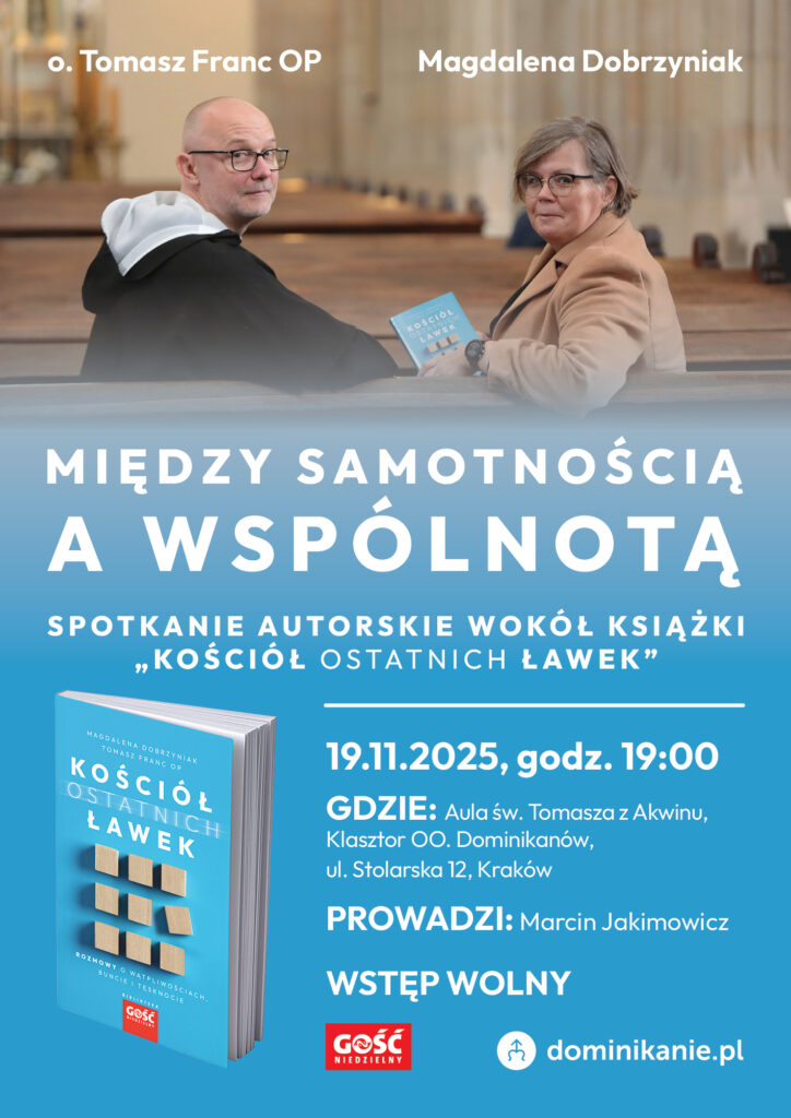 W środę, 19 listopada w auli św. Tomasza z Akwinu w klasztorze ojców dominikanów w Krakowie odbędzie się spotkanie autorskie z o. Tomaszem Francem OP, psychologiem i psychoterapeutą oraz Magdaleną Dobrzyniak, dziennikarką „Gościa Niedzielnego” wokół nowej książki pt. „Kościół ostatnich ławek”.
