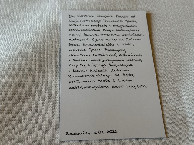 1 lutego 2026 roku w Radoniach s. Cecylia złożyła pierwszą profesję zakonną.
